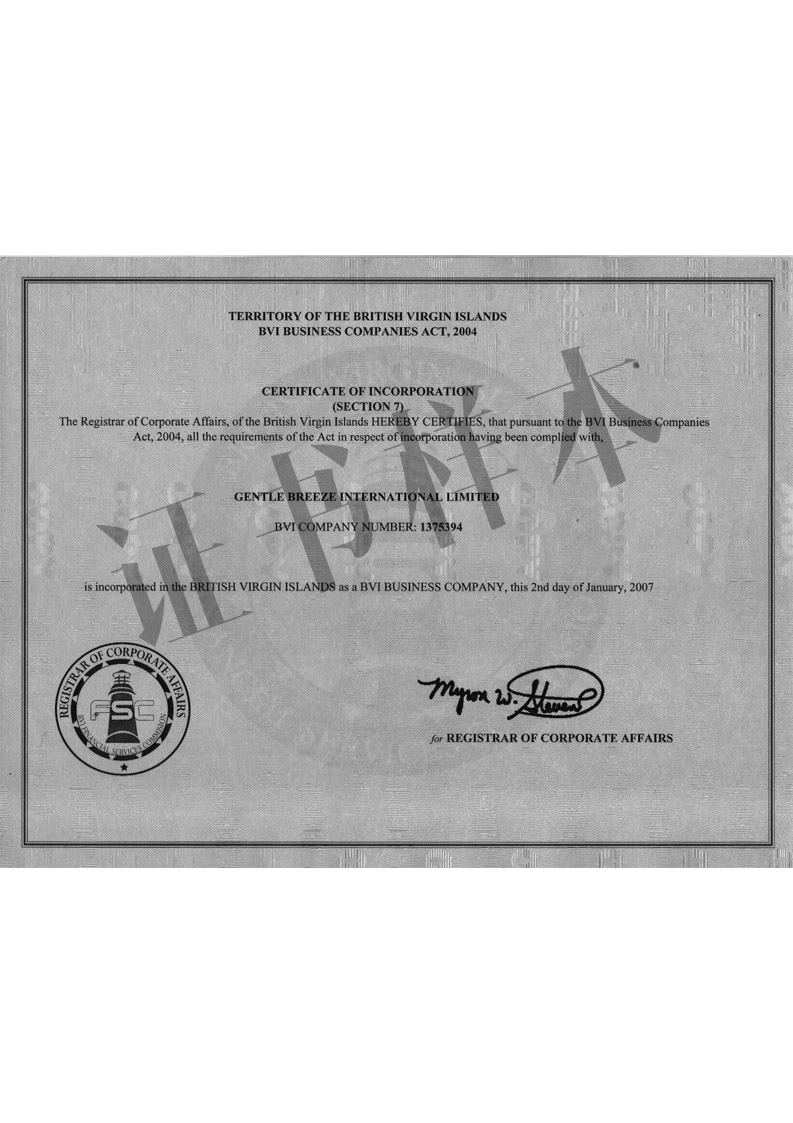 • 公司注册证书